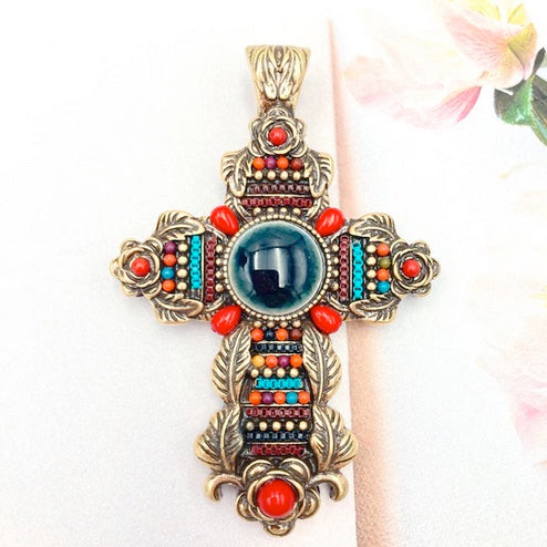 Stunning Black Gold Beaded Stone Rhinestone Cross Magnetic Pendant