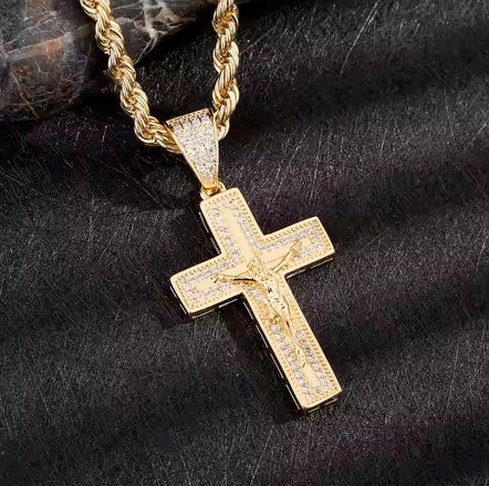 18K Gold Plated On Stainless Steel Thick Cross With Bible Verse On Side And Long Chain