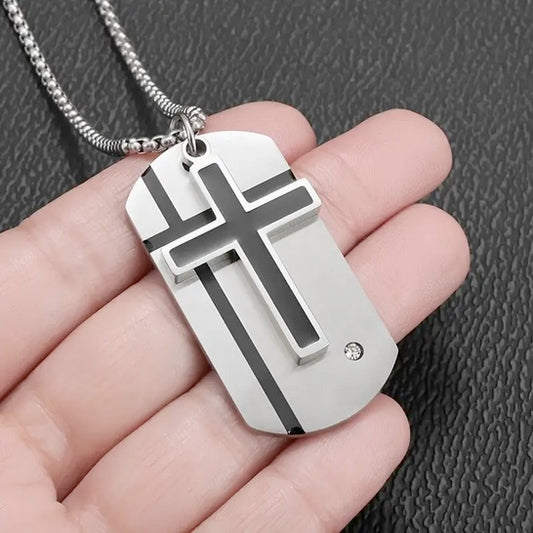 Cubic Zerconia Double Pendant Men's Dog Tag Style Cross Necklace