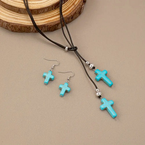 Vintage Boho Adjustable Length Cross Turquoise Necklace and Earring Set