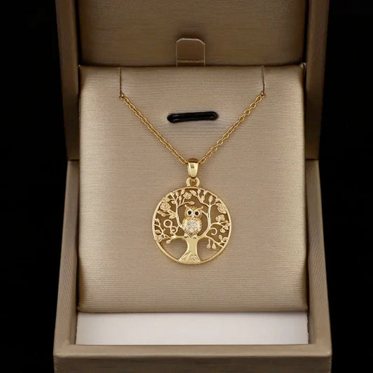 Elegant Owl Tree of Life Necklace for Women, Copper Inlay Abalone Shell, Cubic Zirconia, and Titanium Steel Chain