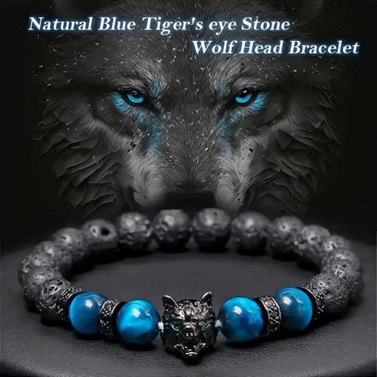 Natural Blue Tiger Eye Stone With Volcanic Black Rock Wolf Bracelet