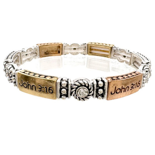 Experience the power of faith with our John 3:16 Tritone Stretch Bracelet! This beautiful piece features the powerful message of John 3:16, intricately designed in three tones of gold, silver, and rose gold. The stretch design ensures a comfortable fit for all, making it a perfect accessory for any occasion. Embrace the strength and beauty of your beliefs with this stunning bracelet.