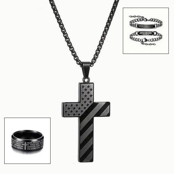 Three Piece Black American Flag Cross Bracelet, Ring And Necklace Combo Set For Men