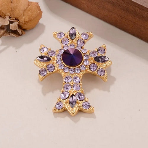 Vintage 14K Gold Plated Cross Brooch With Purple Rhinestones