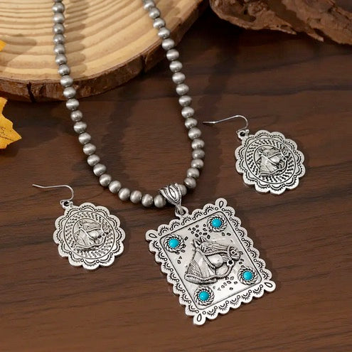Vintage Style Silver-Plated Turquoise Mosaic Horse Head Pendant Necklace and Earrings Set, Zinc Alloy Jewelry